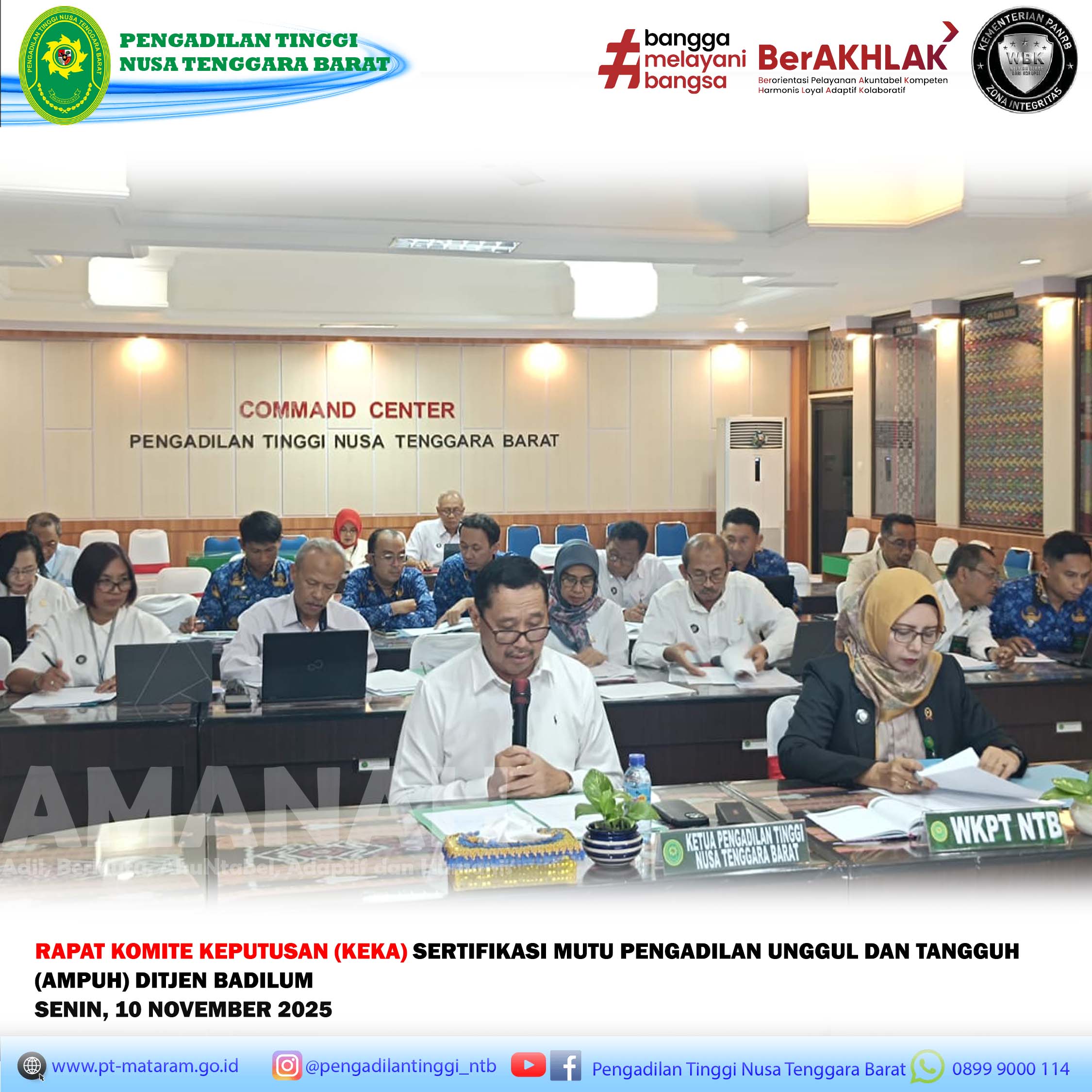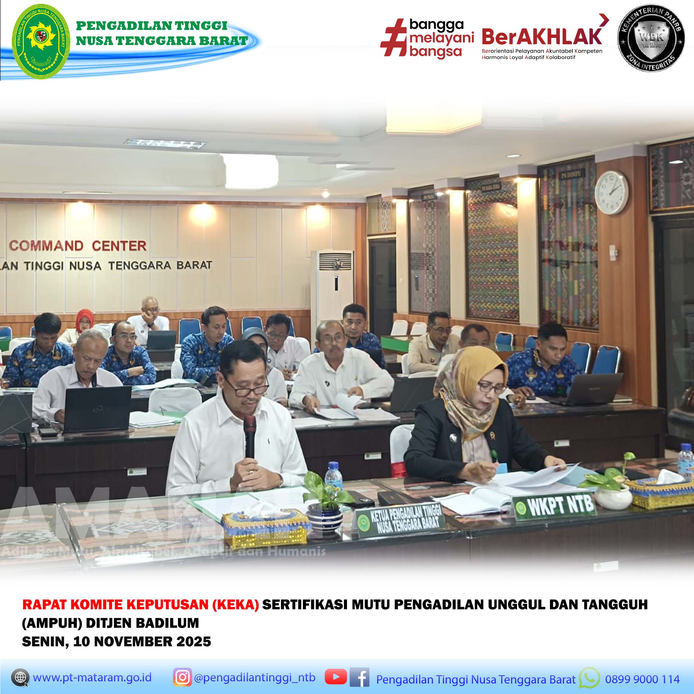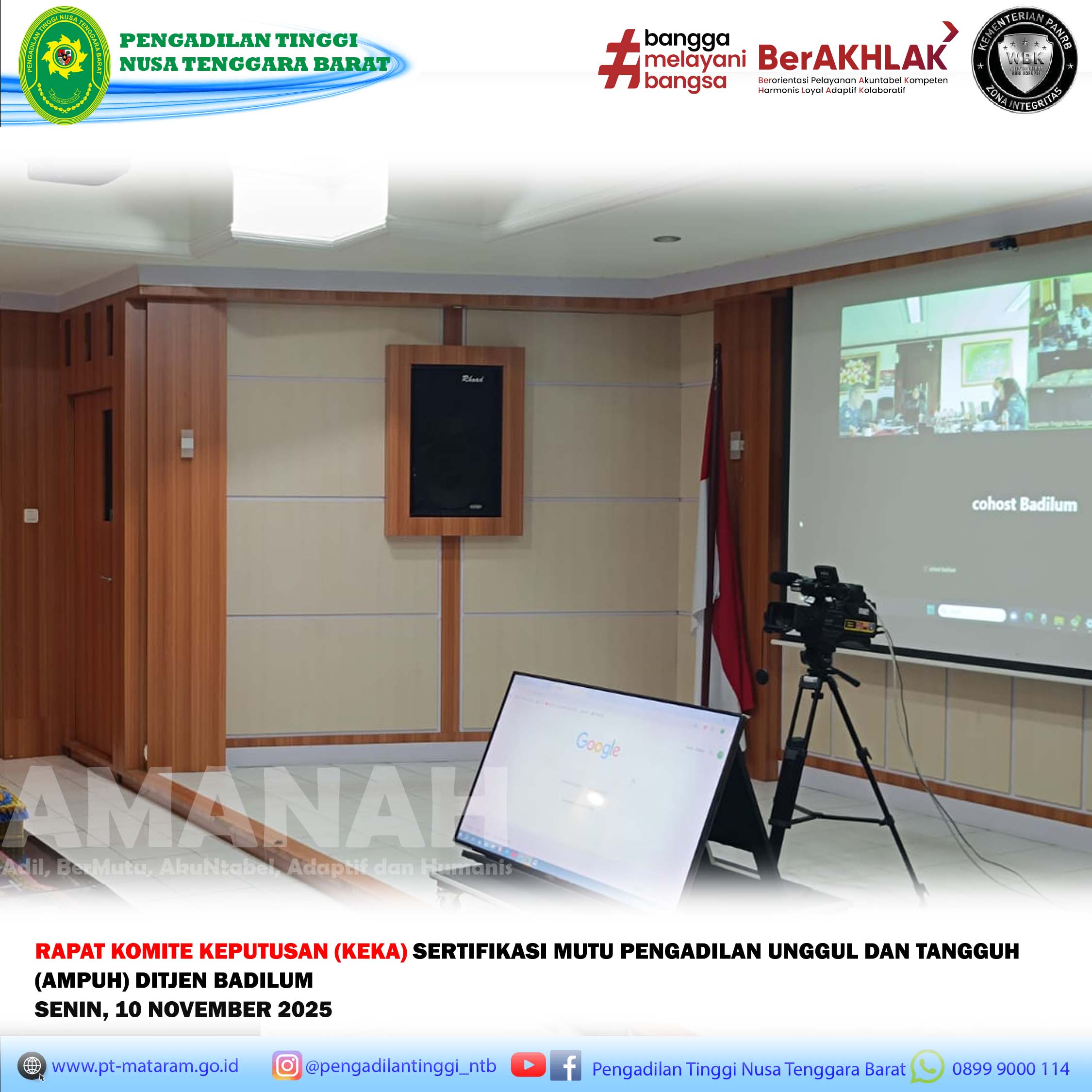 Mataram(10/11/2025) Ketua Pengadilan Tinggi NTB didampingi Wakil Ketua, Para Hakim Tinggi Pengawas Daerah mengikuti Rapat Komite Keputusan (KEKA) Sertifikasi Mutu Pengadilan Unggul dan Tangguh (AMPUH) yang diselenggarakan oleh Direktorat Penderal Badan Peradilan Umum Mahkamah Agung RI secara daring pada Senin, 10 November 2025.