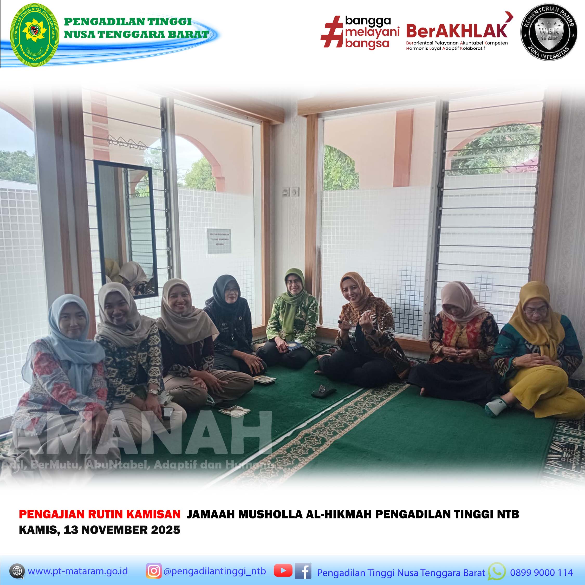 Kegiatan Pengajian Rutin Kamisan dilaksanakan Rutin 2 (dua) kali setiap bulan atau 2 (dua) minggu sekali untuk mempererat silaturahmi, serta meningkatkan keimanan dan ketakwaan Jamaah Musholla Al Hikmah Pengadilan Tinggi NTB.