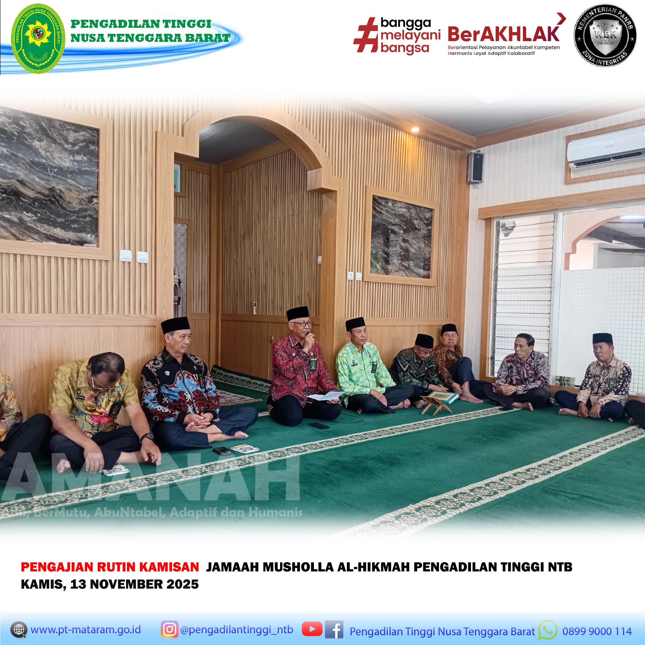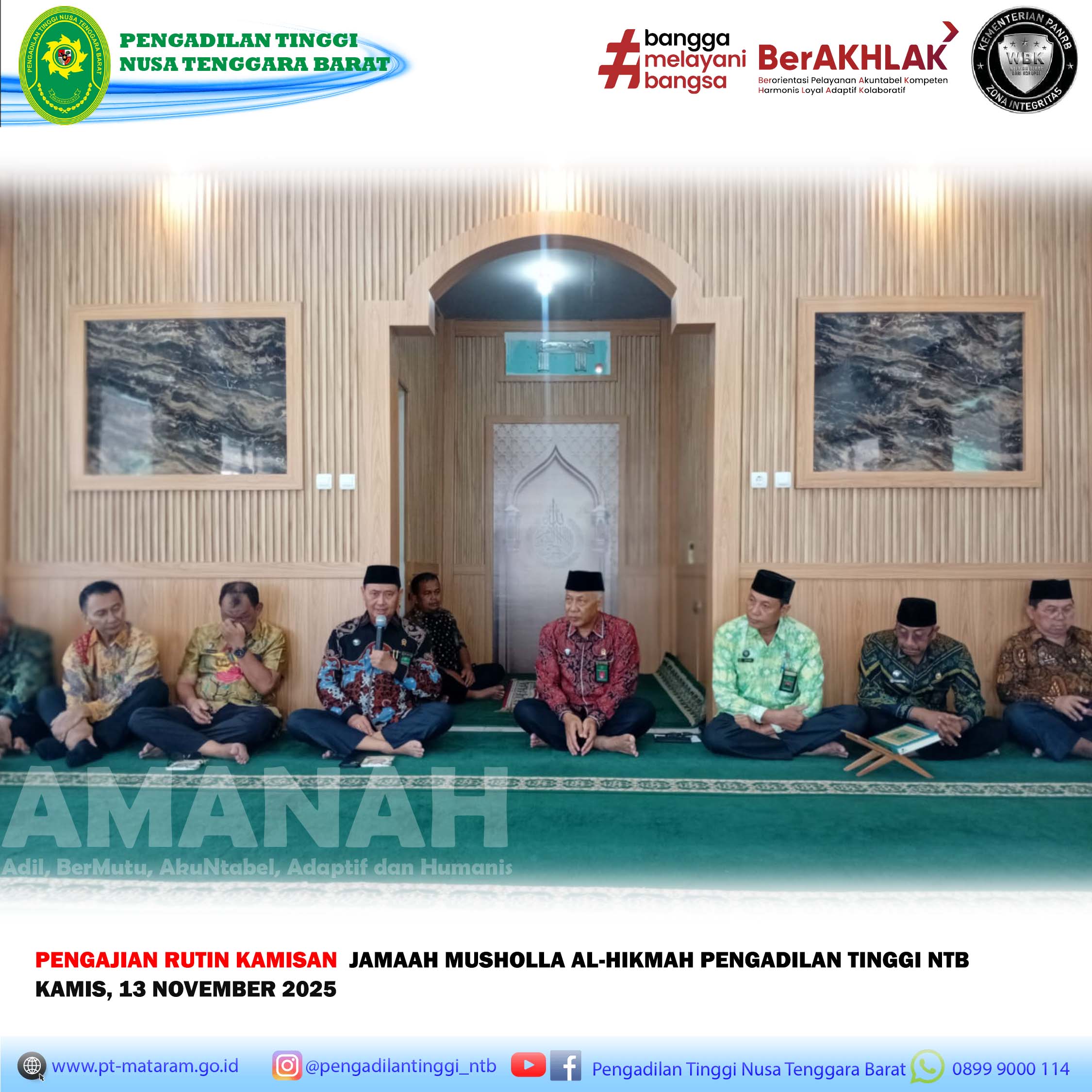 Kegiatan Pengajian Rutin Kamisan dilaksanakan Rutin 2 (dua) kali setiap bulan atau 2 (dua) minggu sekali untuk mempererat silaturahmi, serta meningkatkan keimanan dan ketakwaan Jamaah Musholla Al Hikmah Pengadilan Tinggi NTB.
