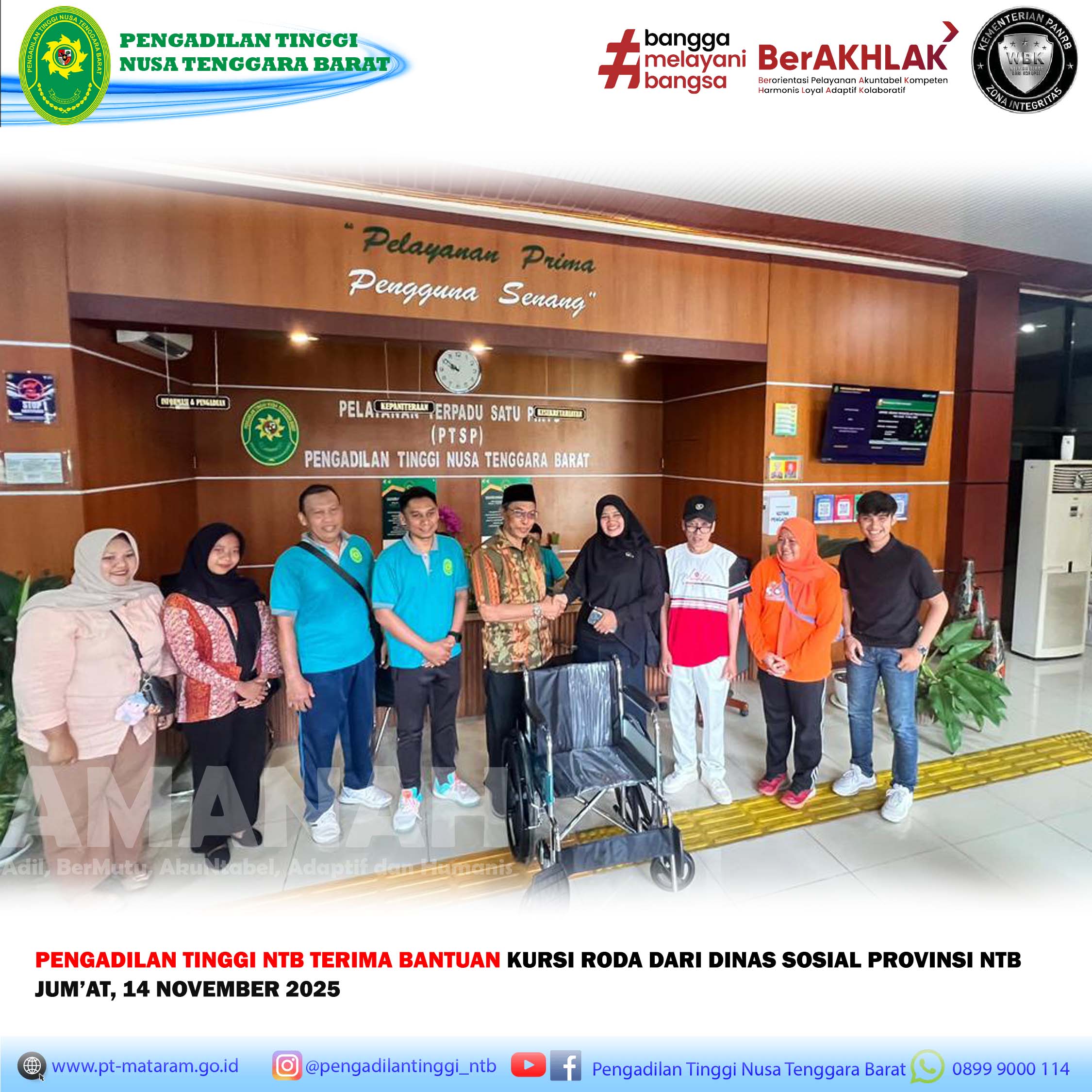 Mataram(14/11/2025) Pada Jum’at pagi, 14 November 2025 Dinas Sosial Provinsi NTB memberikan Bantuan berupa Kursi Roda kepada Pengadilan Tinggi NTB untuk mendukung pelayanan Pengadilan bagi Penyandang Disabilitas . Penyerahan Bantuan diterima langsung oleh Sekretaris Pengadilan Tinggi NTB, diharapkan dengan adanya penambahan Kursi Roda ini dapat meningkatkan pelayanan publik di Pengadilan bagi Penyandang Disabilitas.