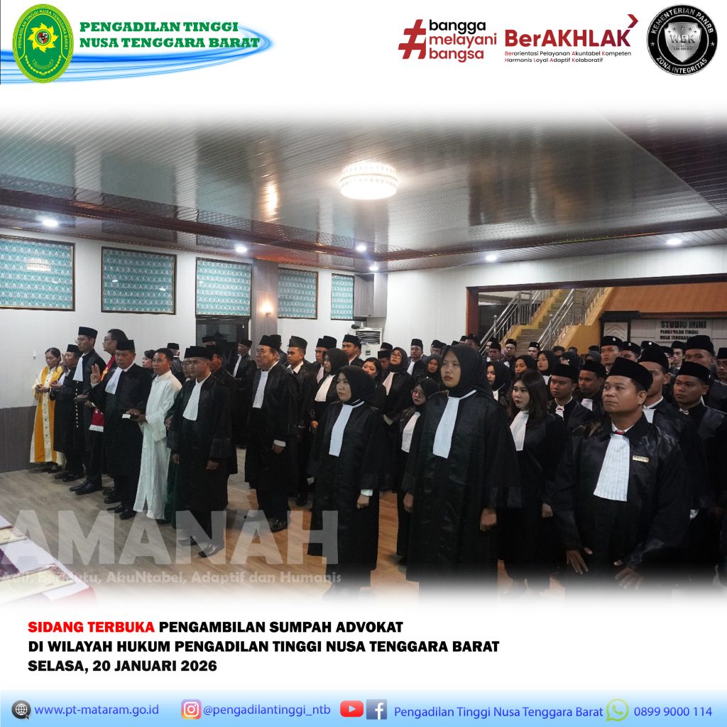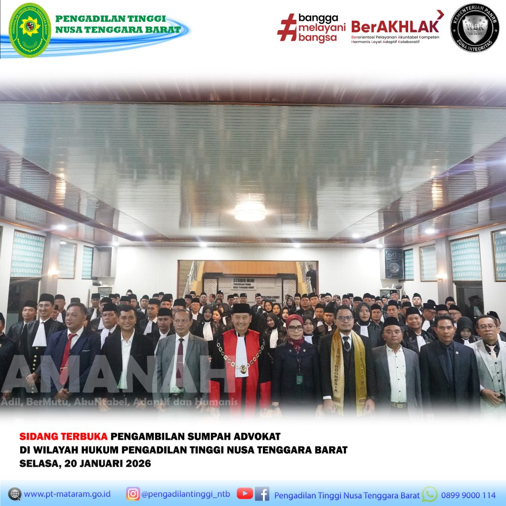 Mataram (20/01/2026). Ketua Pengadilan Tinggi NTB, Bapak Dr. Hery Supriyono, S.H., M.Hum. memimpin acara Pengucapan Sumpah/Janji Advokat di Wilayah Nusa Tenggara Barat bertempat di Ruang Sidang Utama Pengadilan Tinggi NTB pada Selasa, 20 Januari 2026.