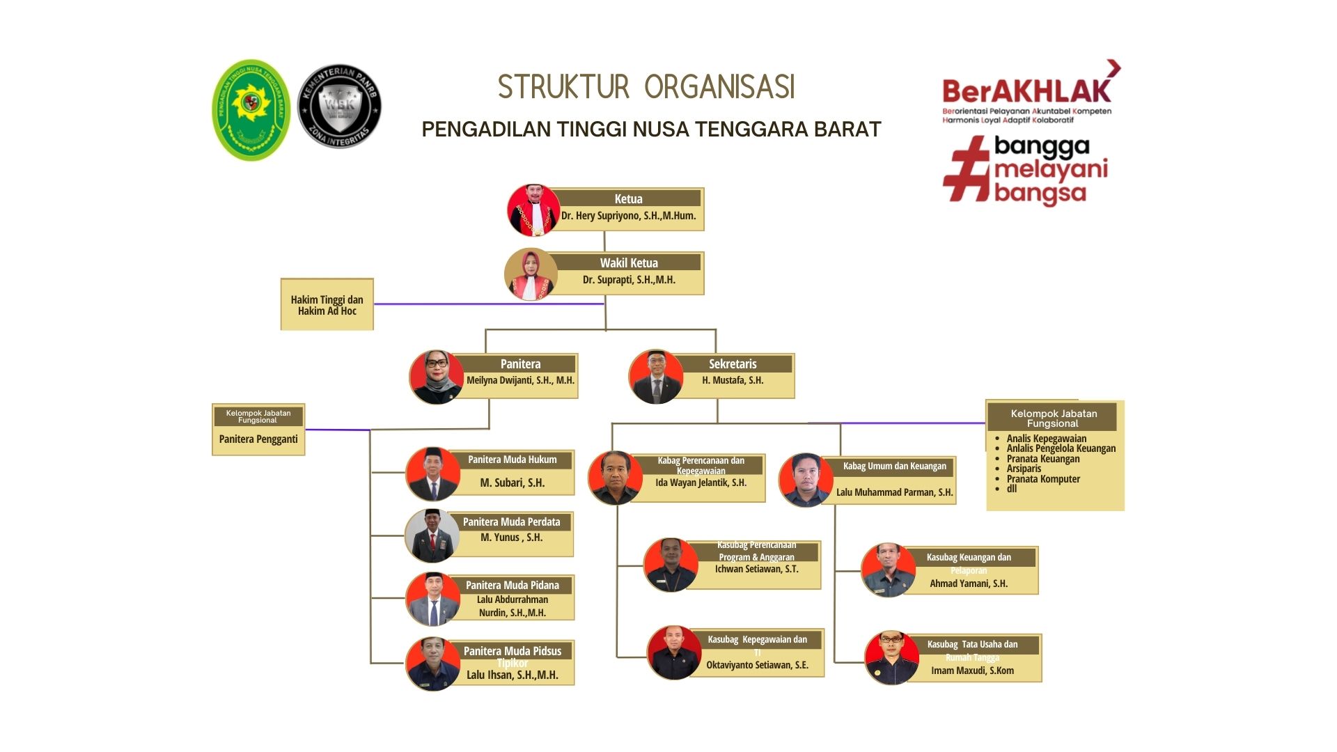 Sesuai dengan Undang-undang Nomor 49 tahun 2009 tentang perubahan kedua atas Undang-undang Nomor 2 Tahun 1986 tentang Peradilan Umum, serta Perma NomorĀ 7 Tahun 2015 yang telah beberapa kali diubah terakhir dengan Perma Nomor 1 Tahun 2025 maka secara organisatoris dan administratif Pengadilan Tinggi Nusa Tenggara Barat memiliki struktur organisasi sebagai berikut :