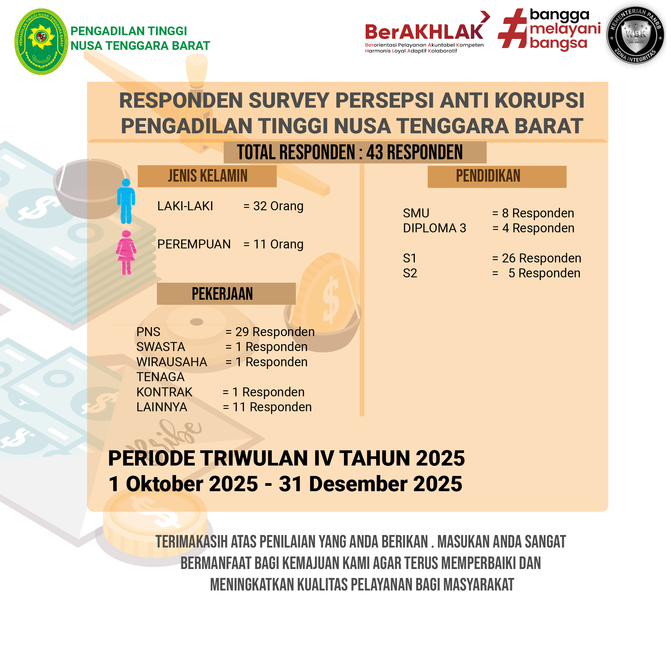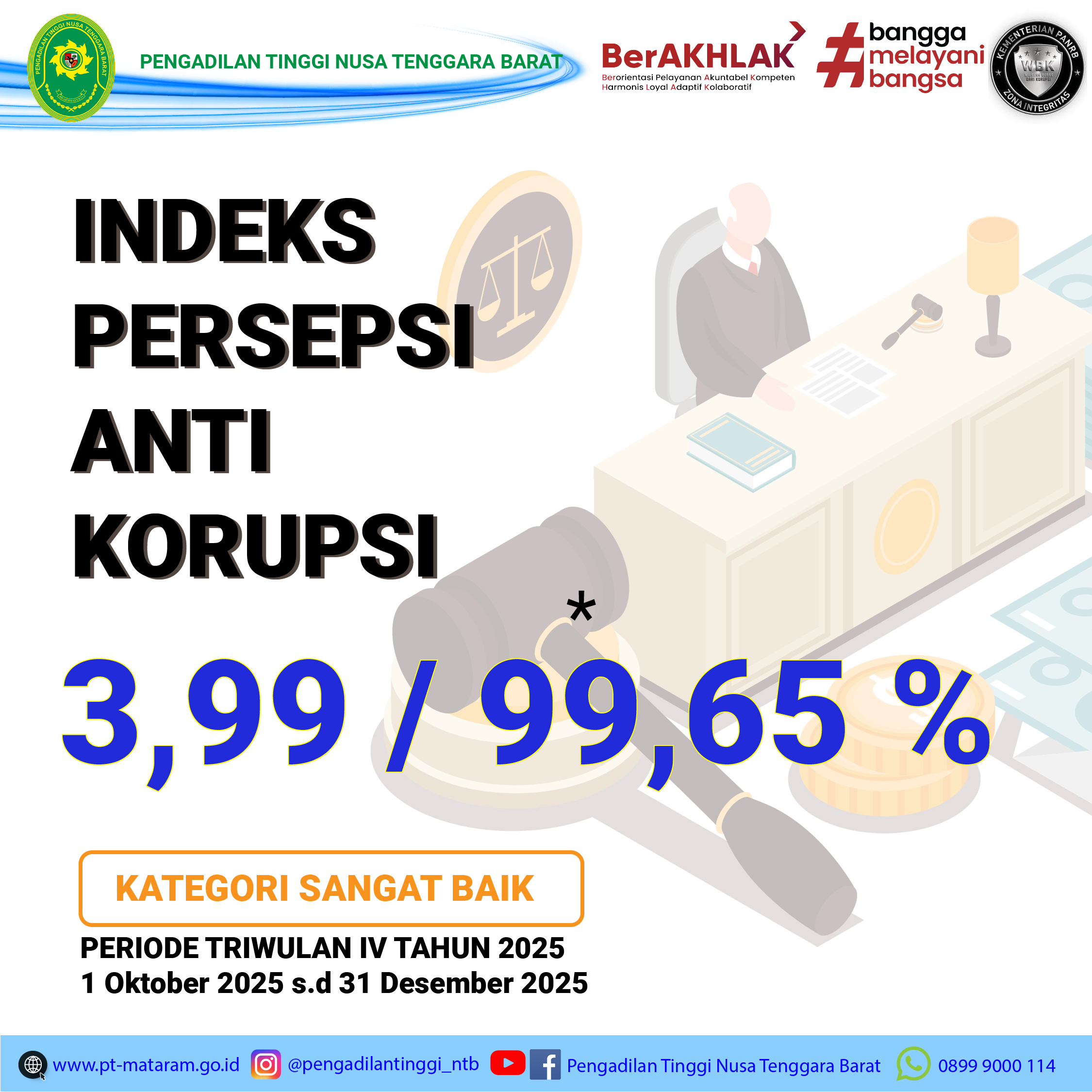 Dari hasil Survei Persepsi Anti Korupsi yang telah dilaksanakan Pengadilan Tinggi Nusa Tenggara Barat diperoleh informasi bahwa pada Pengadilan Tinggi Nusa Tenggara Barat masuk pada kategori Sangat Baik /Bersih Dari Korupsi dengan Nilai Indeks Persepsi Anti Korupsi 3,99 atau 99,65 % pada Triwulan IV Tahun 2025, Periode 1 Oktober sampai dengan 31 Desember 2025.